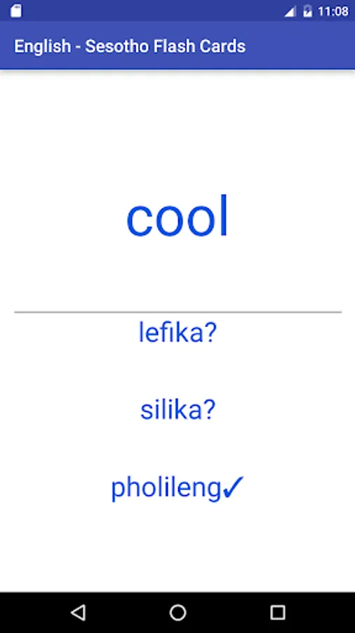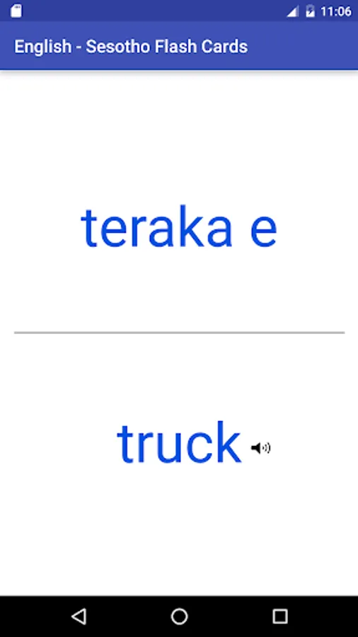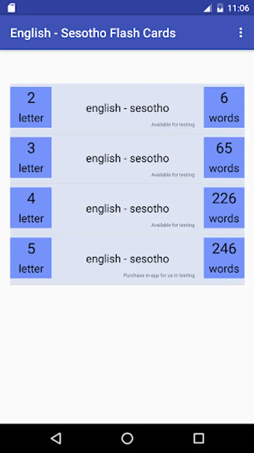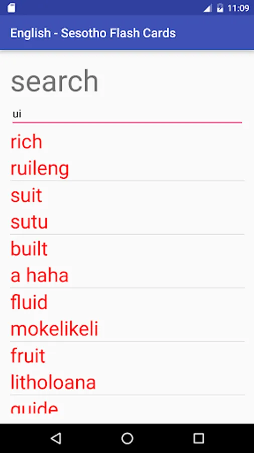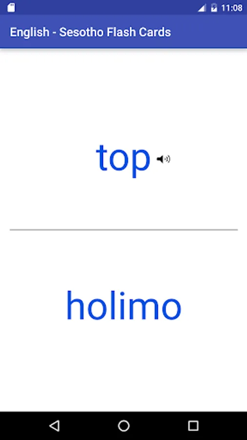 A tiny app that helps you along with learning the basics of Sesotho. Containing 1, 2, 3, 4 and 5 letter English words translated to Sesotho. Also available are search facilities (free), a shuffle mode (free) to randomise cards as well as a test mode (in-app paid for).