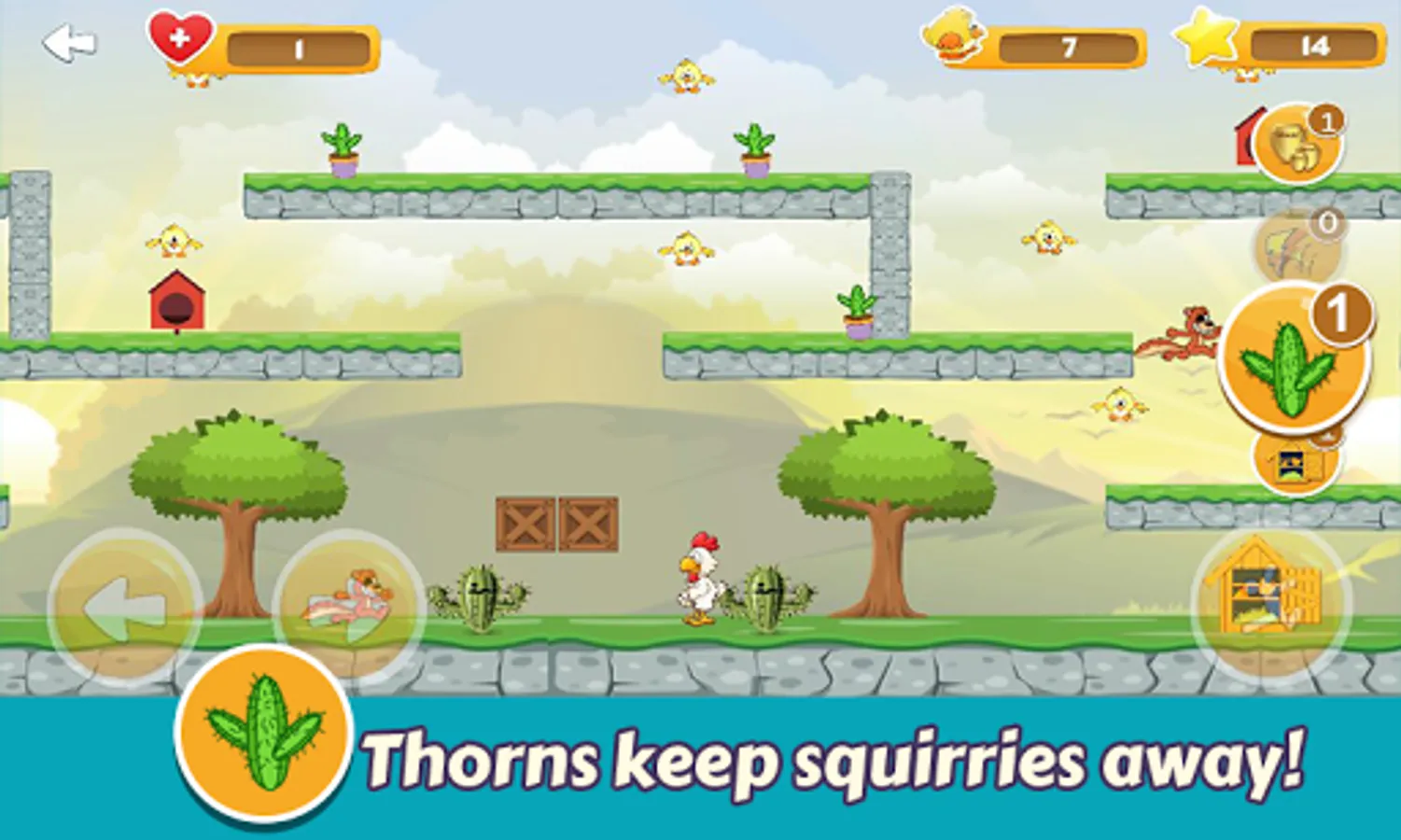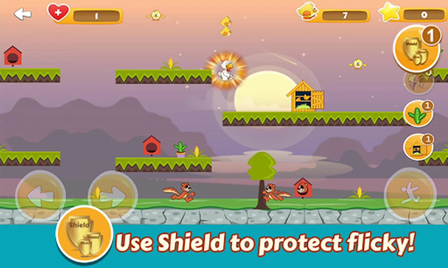 Flicky Chicky is an endless tap jumping and running game in which our Super Chicken, Flicky, lives happily with her chicks (Chickies). One day, they all come under a deadly attack of a squirrel (Squirry) and all her chicks gets scattered. The squirrel does not allow Flicky to gather the Chicks and constantly bullies them.