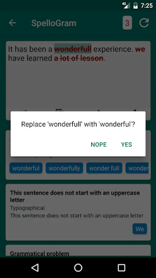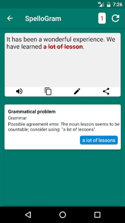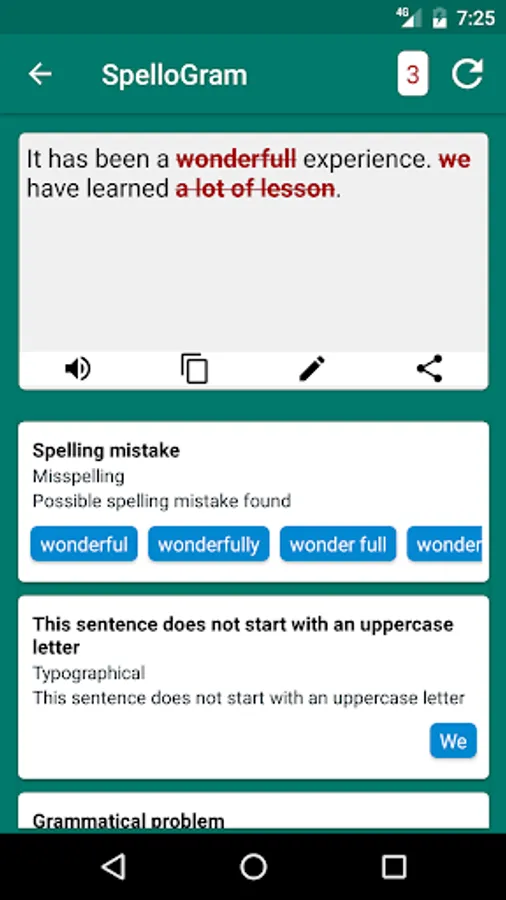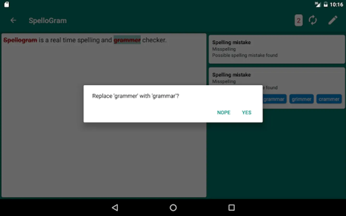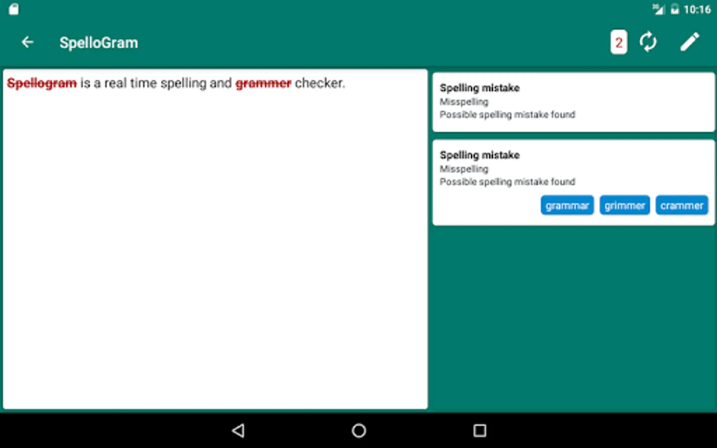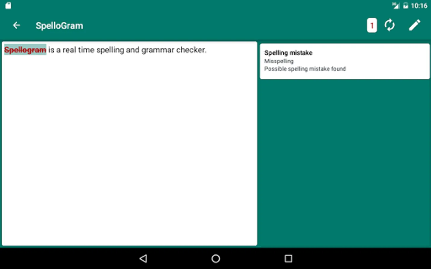 With Spellogram, You can check and correct spelling and grammar of 7 languages at real time with just one click. You can correct your documents with the best possible suggestion provided by the intelligent language engine or by making your own edits.