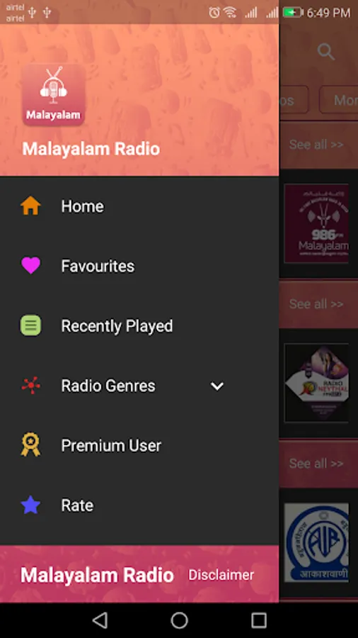 All famous FM radio like Radio Mango, Club FM, Radio Mirchi, Flowers FM, AIR, etc. are available in the app. You can add your own custom Radio too. The best options in the app are:-