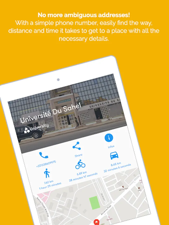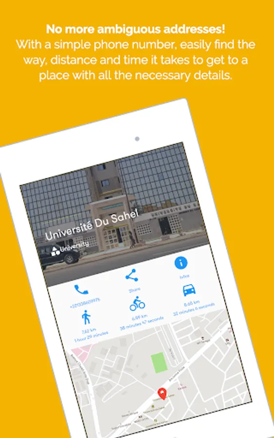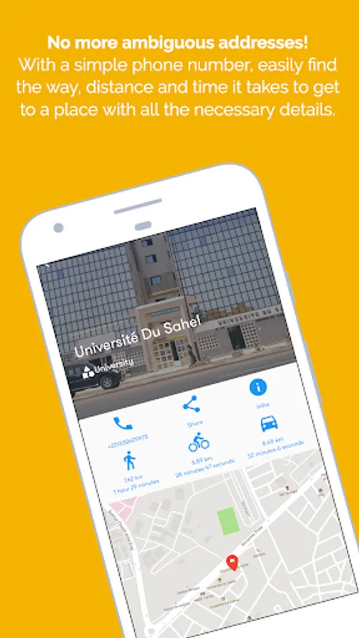 With a simple phone number, easily find the way, distance and time it takes to get to a place with all the necessary details.