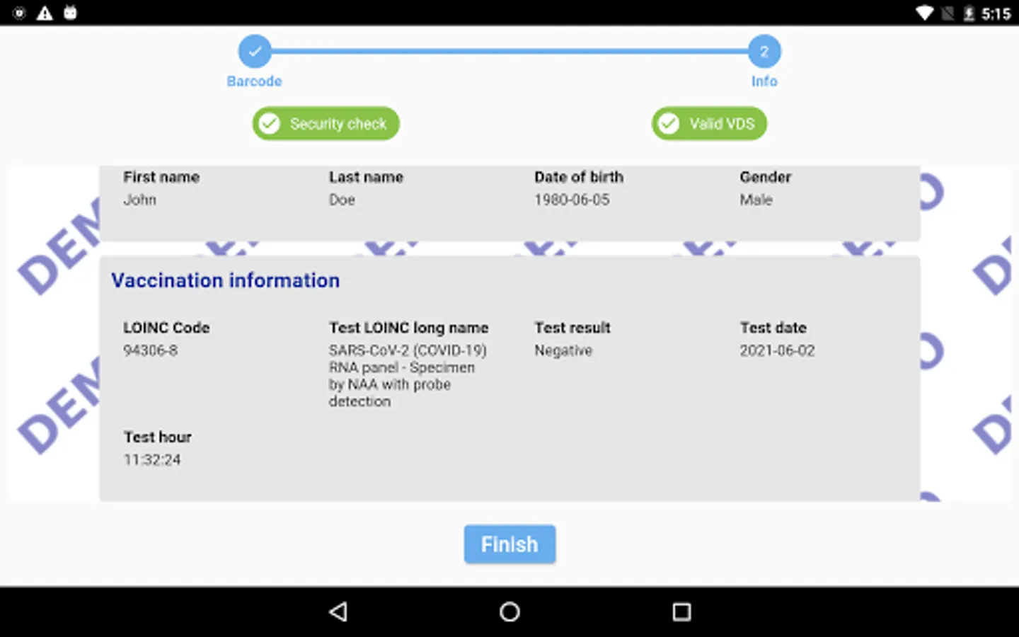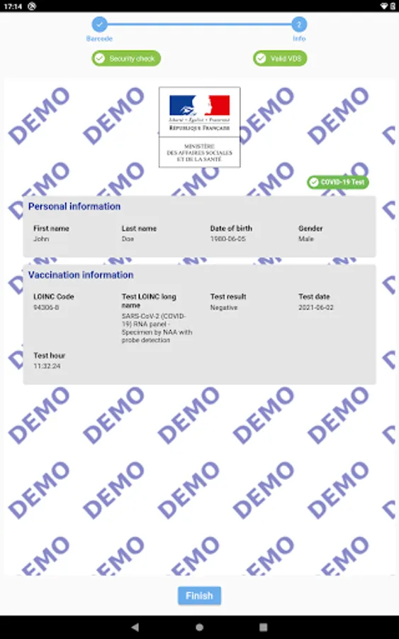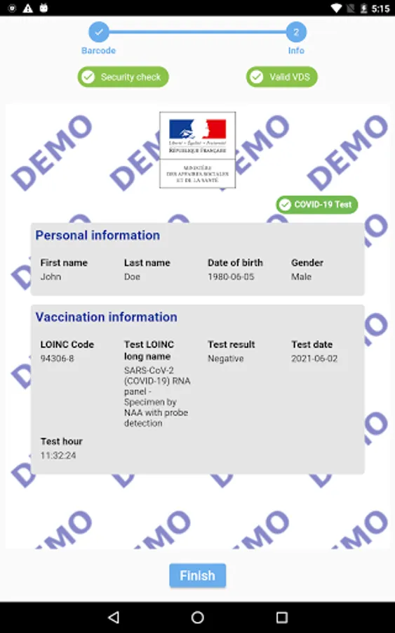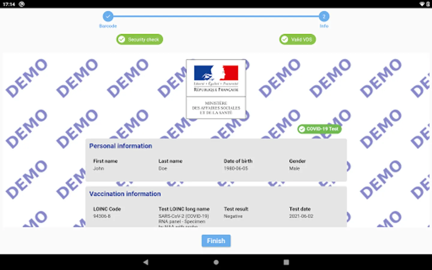 The application verifies 2D barcodes (Datamatrix, QR Code and PDF417) compliant with the AFNOR Z42-105 standard and the Otentik Network extensions. This VDS encapsulates key data from a document in accordance with the associated use case. This data is electronically signed, enabling Otentik Code Reader to detect any tampering, to confirm the authenticity of the data and the legitimacy of the issuer.