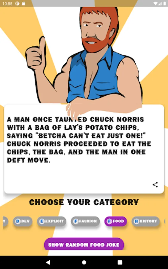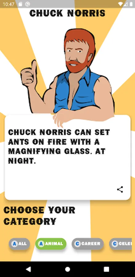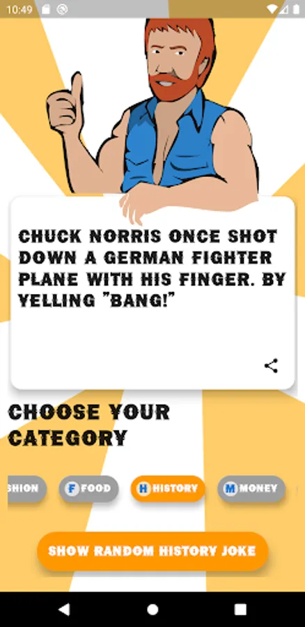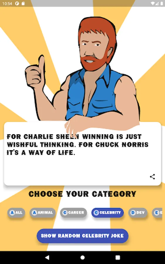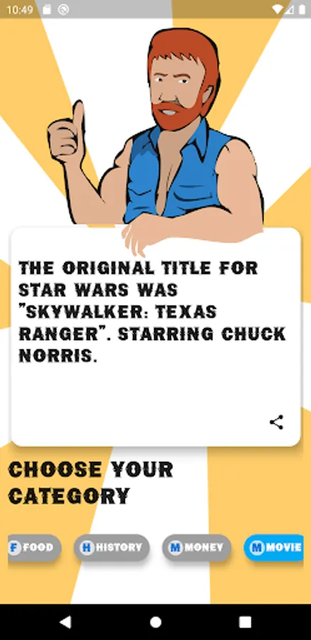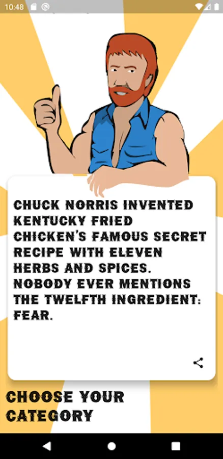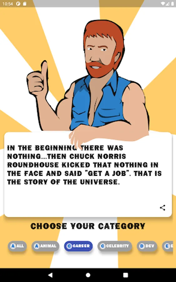 The app provides you random stories of Chuck Norris' life. You're able to select from different categories like: