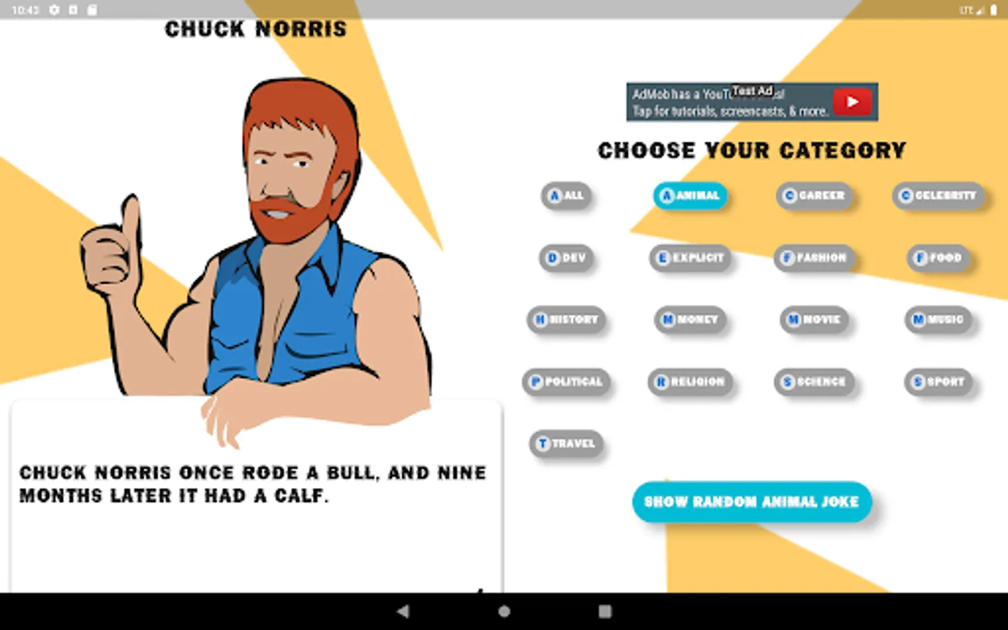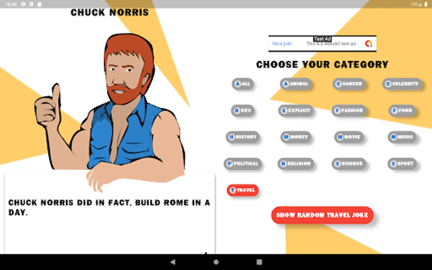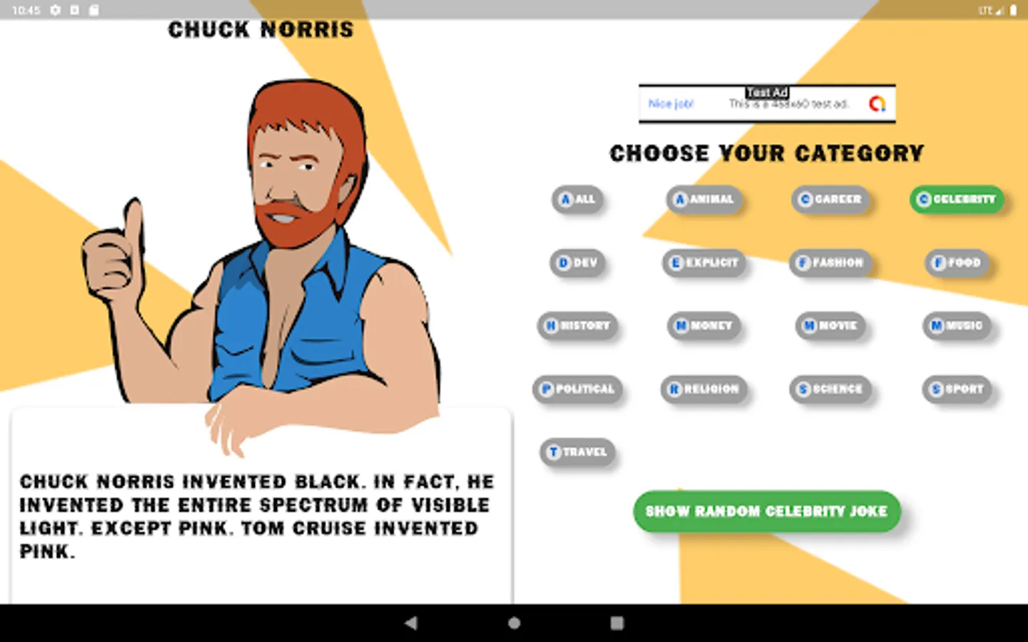 The app provides you random stories of Chuck Norris' life. You're able to select from different categories like: