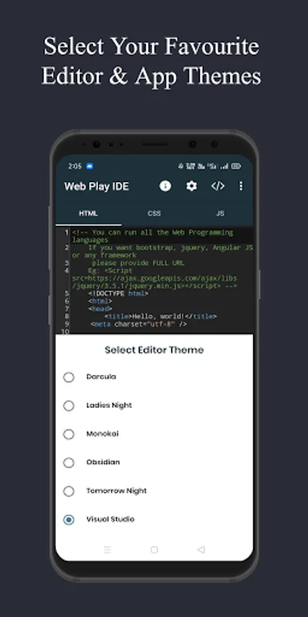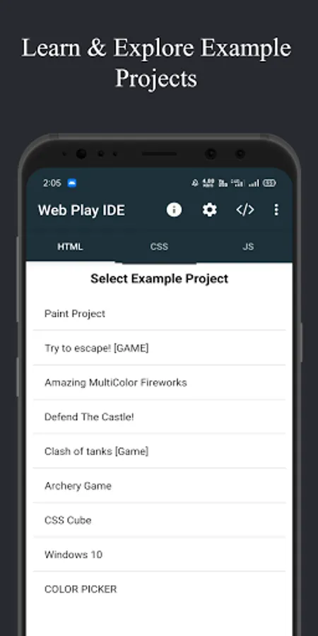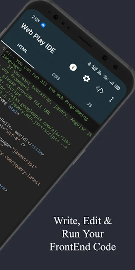 Web Development is also a Web editor (Code Editor) and Complete IDE which helps users to run the code within the app and Execute the webpage easily or try the example Project code to understand the concept better.