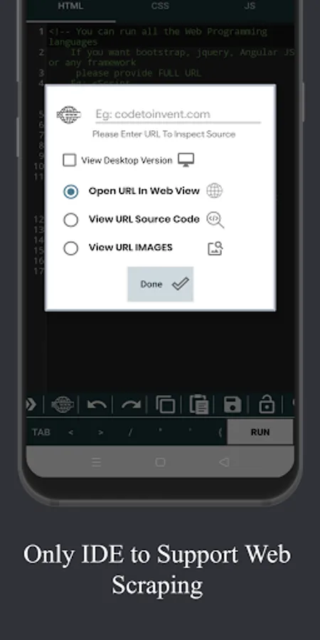 It also contains Web Scraping Features you have to enter the URL and Select the Option ( Like getting Source Code) or Scrape (Get) all the Images of the following URL. Load URL in Web View etc...