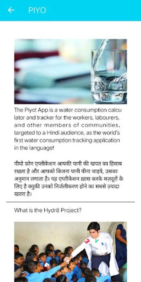 The Piyo! App is a water consumption calculator and tracker for the workers, labourers, and other members of communities, targeted to a Hindi audience, as the world’s first water consumption tracking application in the language!