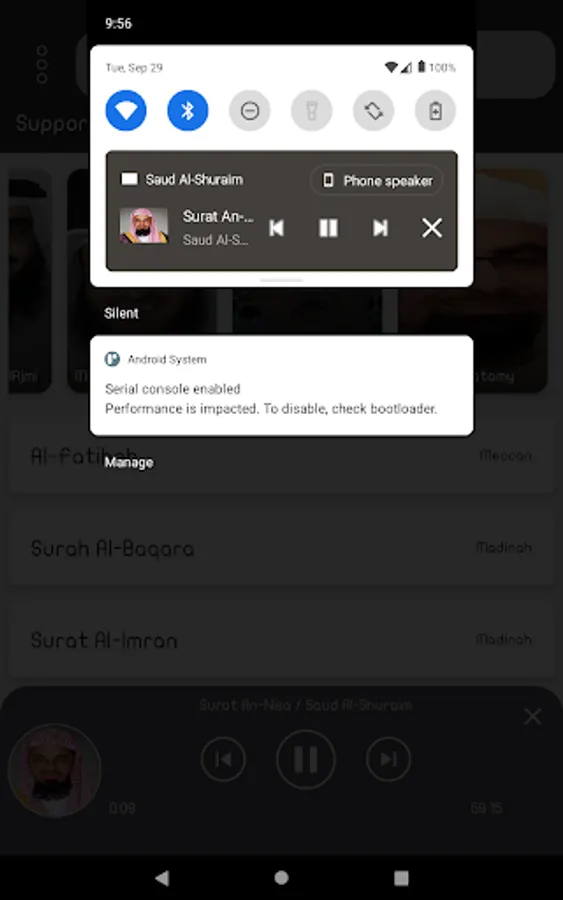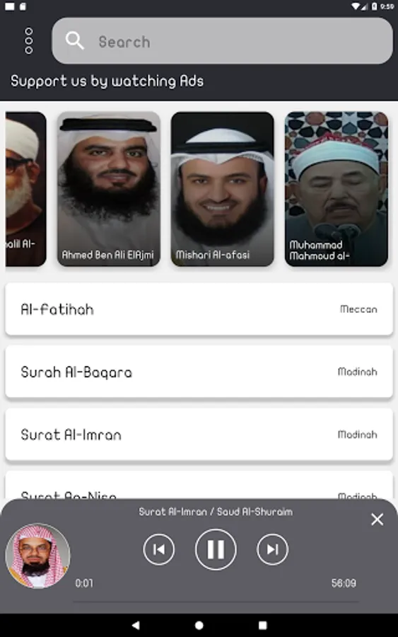 The application of the Holy Qur’an with the voice of the reciter Saud Al-Shuraim allows you to hear all the surahs of the Holy Qur’an through your phone or tablet with ease and ease through one application that contains all the surahs of the Holy Qur’an without the Internet. Fans of listening to the reader Saud Al-Shuraim, you will not need to pay money to download the application.