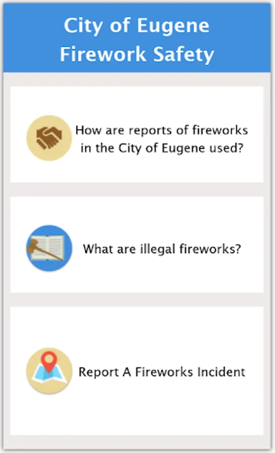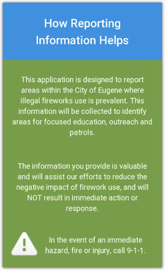 Community members can alert the usage of illegal fireworks via a picture upload and gps coordinates. The data is received on the back end and appropriate actions are taken by the Fire department for the City of Eugene, Oregon.