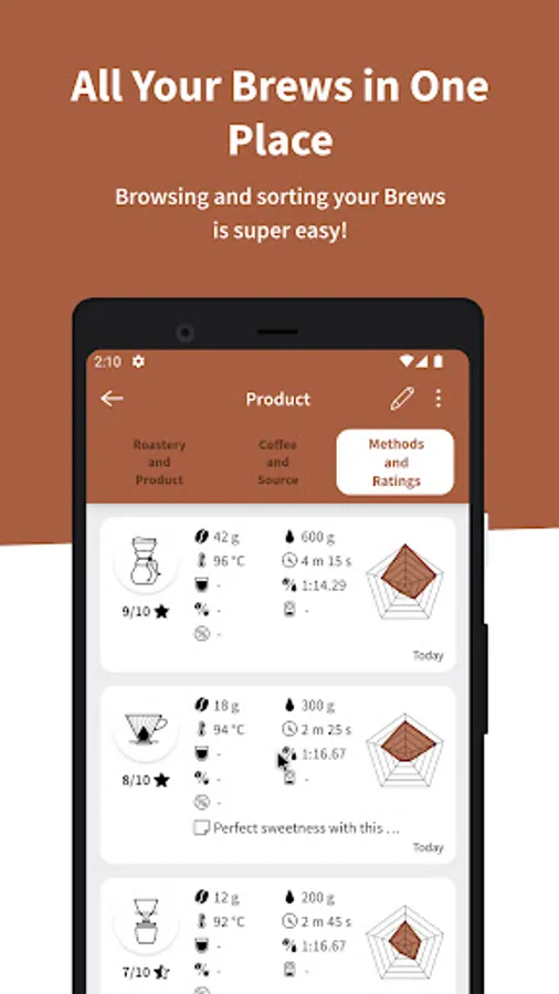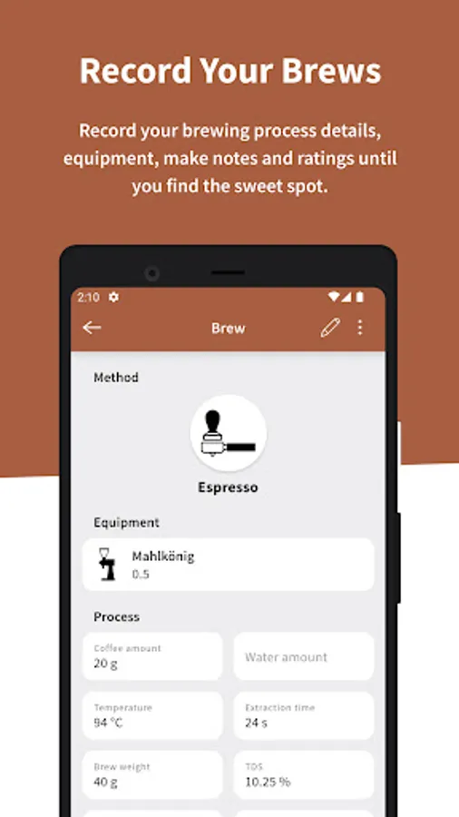 iBrewCoffee lets you save specialty coffee beans, record all your brewing recipes, and export print-ready PDF so you can enjoy your coffee journal and share your brewing mastery with your friends.