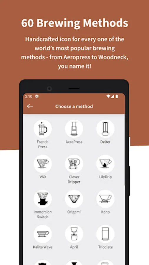 There are 60 of the most popular brewing methods in the app - from Aeropress all the way to Woodneck.