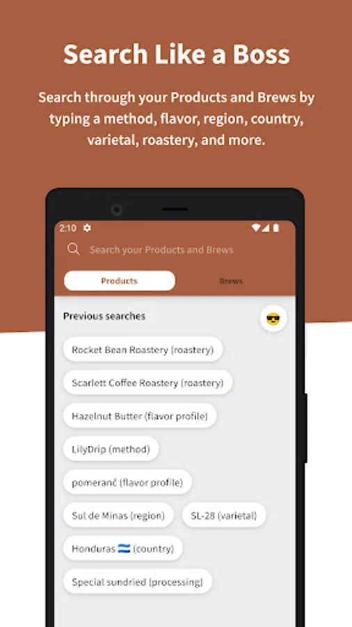 Searching through your Brews and Product is super easy and intuitive. You can search using most of the information you saved, such as a roastery, flavor profile, brewing method, coffee country, region, varietals, and more!