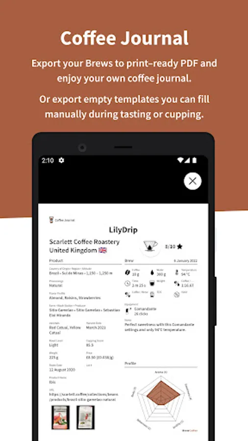 Using the app, you can export your Products and Brews to PDF, print it out, and enjoy your coffee journal.