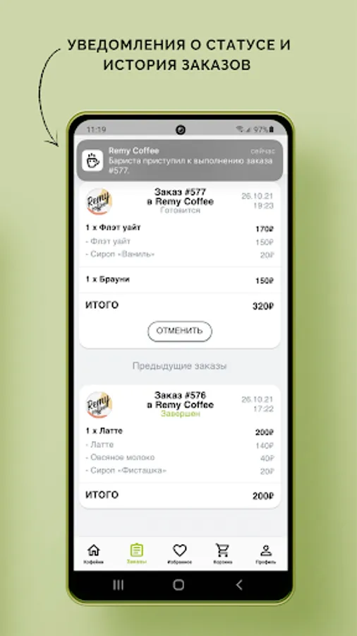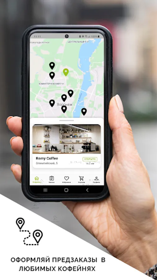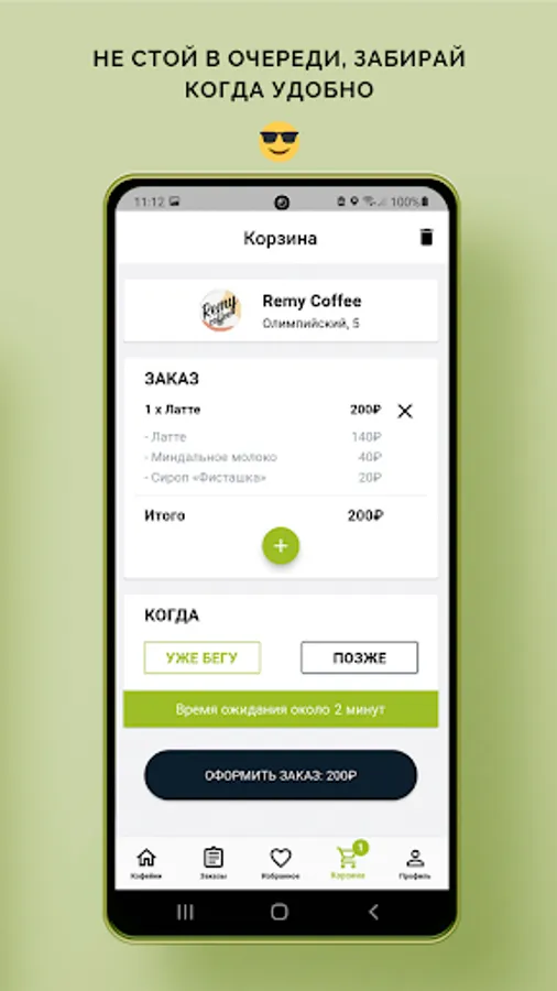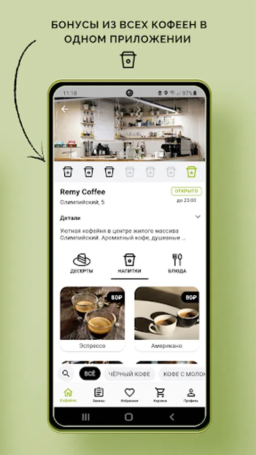 "I want coffee" allows you to forget about queues, because your drink will be ready in time and you can go to your shop without wasting time waiting.