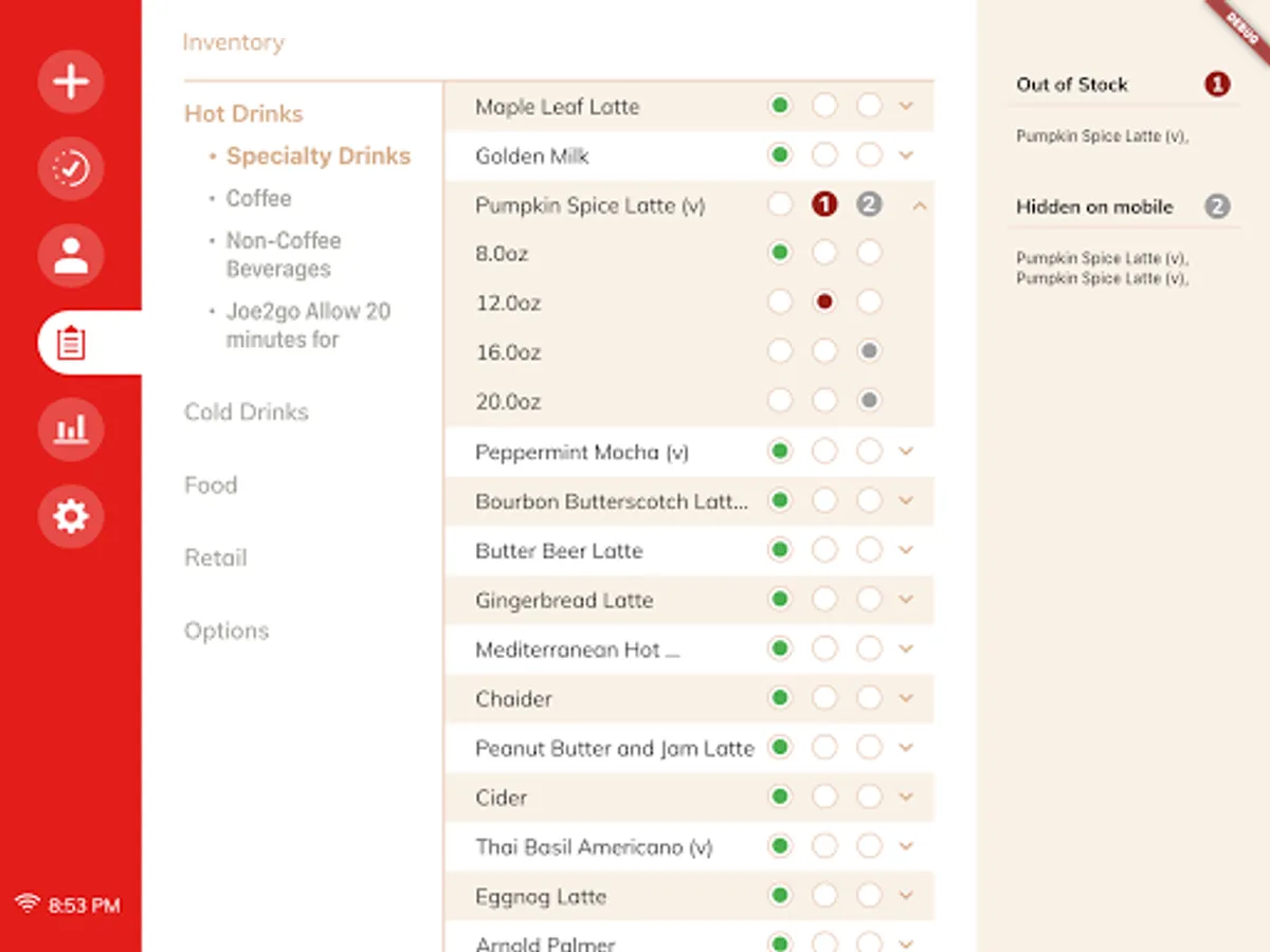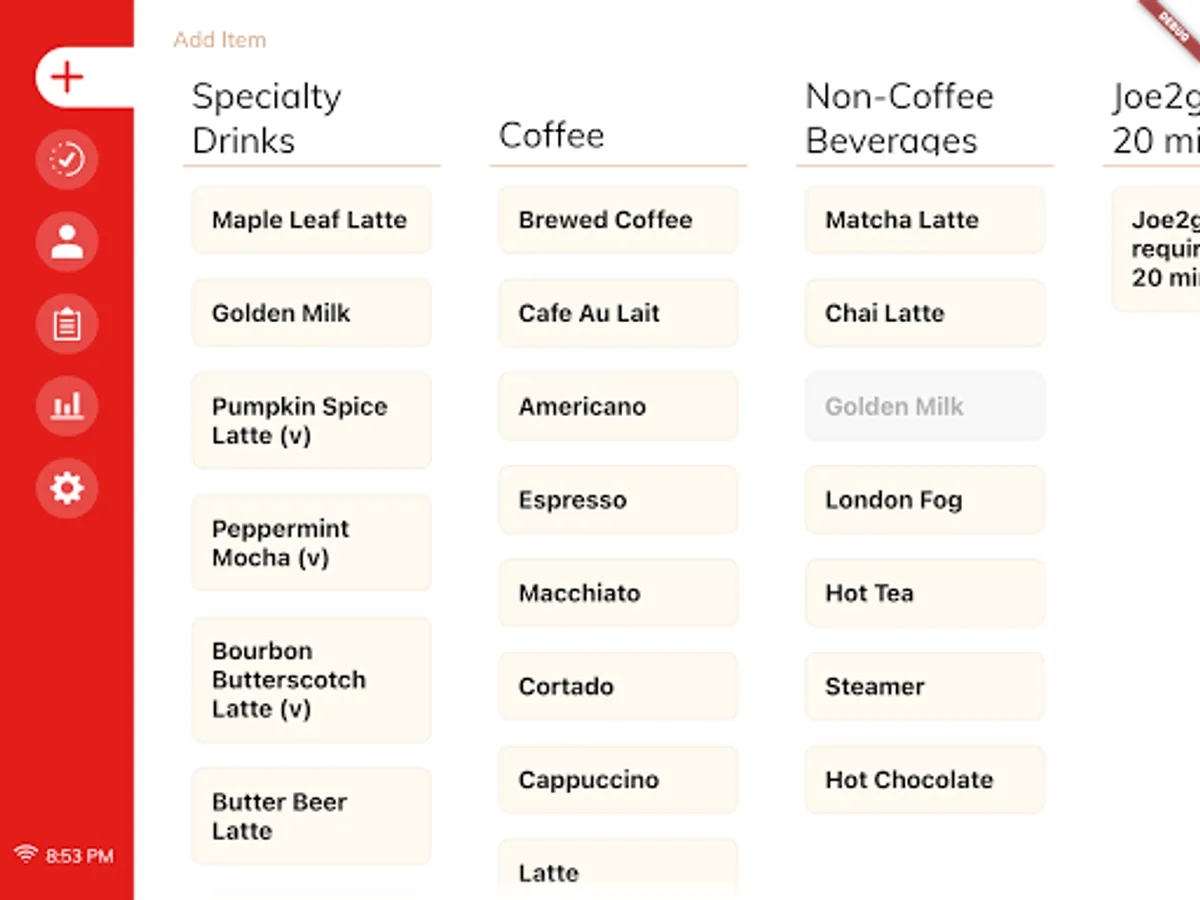 Barista Mode: Accepting and managing incoming orders is a breeze on a dedicated tablet. Designed to fit any workflow, joe allows you to manage orders across multiple devices and custom configure printers to accommodate full-service kitchens and multiple coffee bars. Runs on any iOS or Android tablet or behind any Point of Sale with access to the App Store or Google Play.