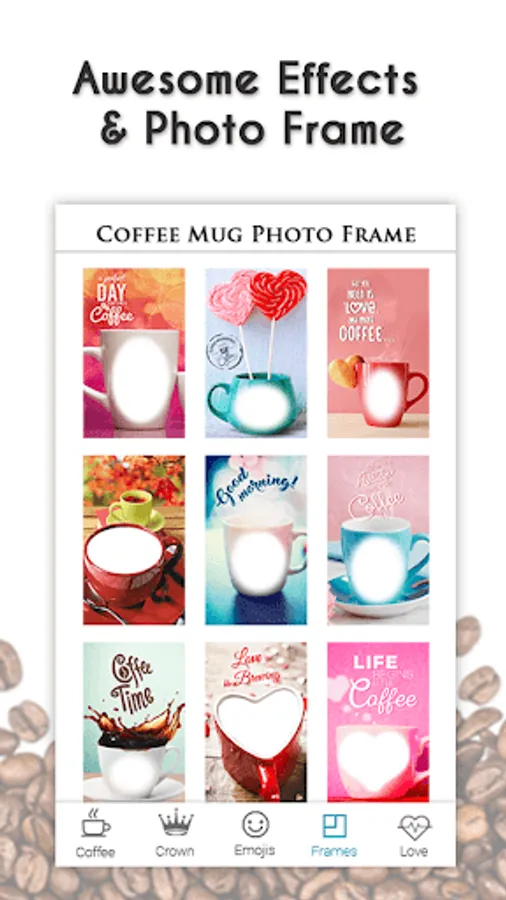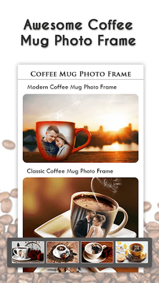 This "Coffee Photo Frame - Mug Photo Editor" App Is Provide More Then 15+ Coffee/Mug Photo Frames Category And 1000+ Coffee Various Frames To Make Your New Coffee Photo Frame Or Mug Photo Editor.It Gatherings Of Impressive And Amazing Coffee Photo Frame - Mug Photo Editor Frames.