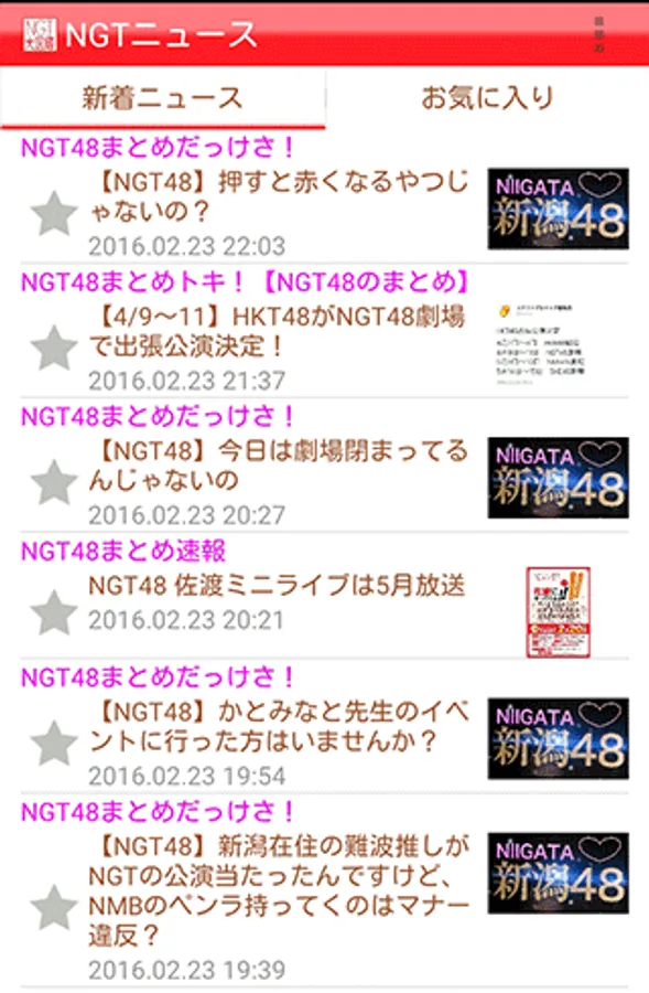 ・ If you tap each article ☆ mark in the "NGT 48 News" list, you can register as a favorite article. Articles registered can be viewed from the "Favorites" tab.
