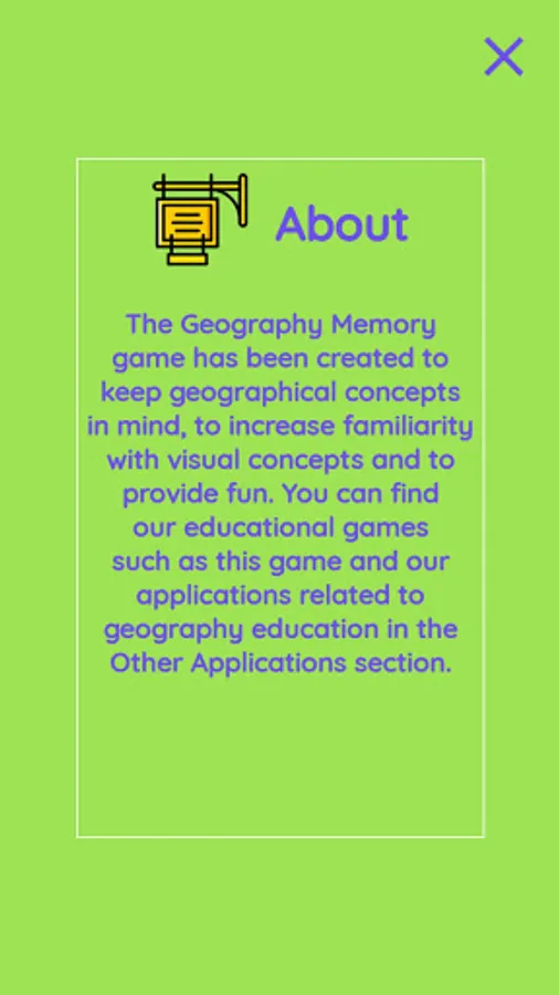 Our game Geography Memory Game, which is based on learning by having fun, as in our other applications, offers a game experience that everyone who loves geography, from seven to seventy, will love to play, have fun and learn.
