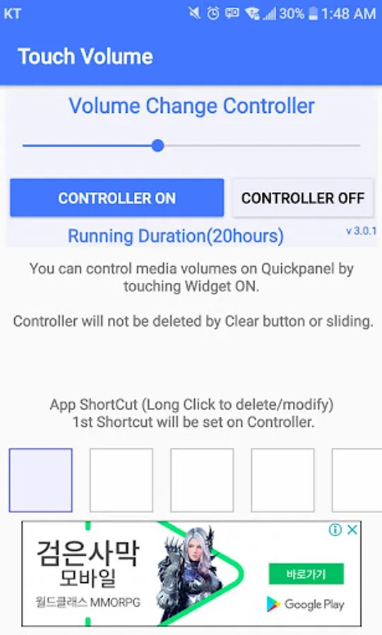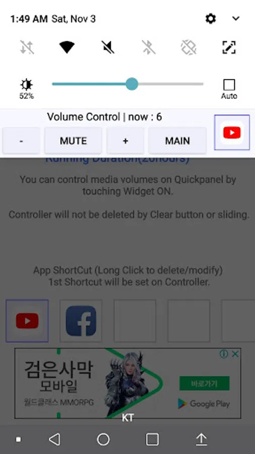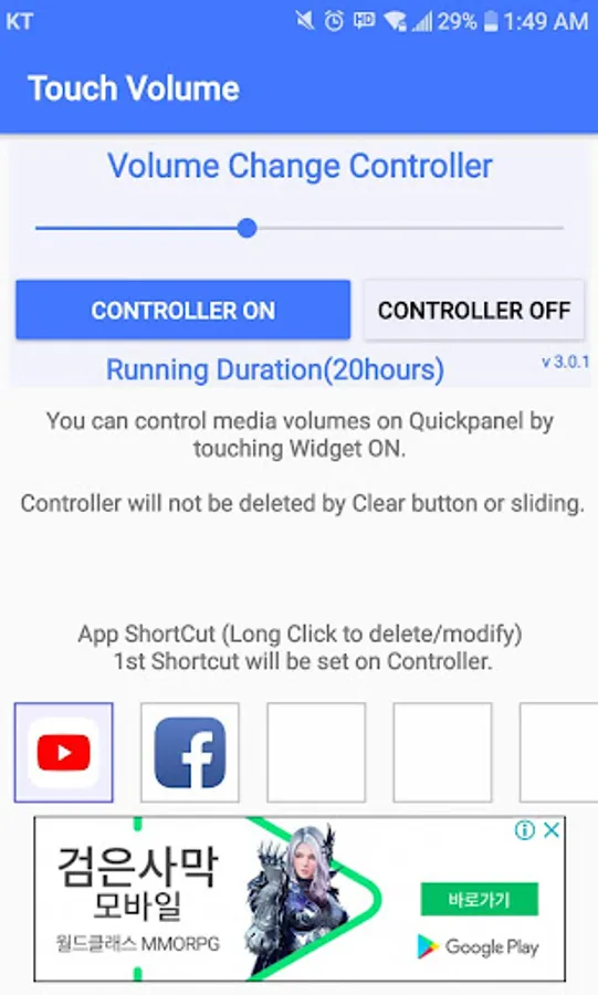 You can activate the Volume Controller which can control your media volume on your status bar on this app. It can be helpful not only on your BROKEN VOLUME KEY but also on your convenience and utility. It will be fixed on your status even though you touch the "Clear" button to erase other notifications excepting touching OFF buttons on this app in "normal" ways. In main on this app, you also control your media volume with seekbar.