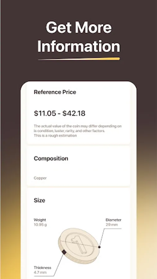 Our app is more than identifying old coins: a coin scanner, coin checker, and coin grading tool. This means you can effortlessly discover their origin, evaluate their condition, and ascertain their worth. It is your all-in-one solution.