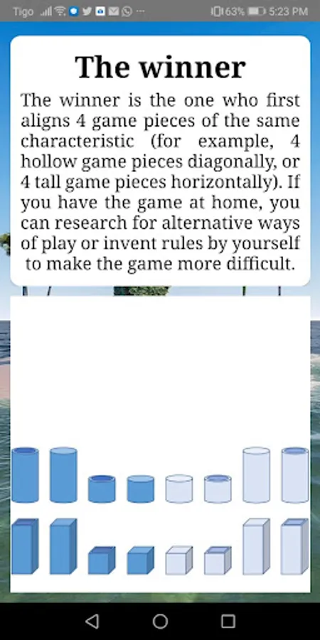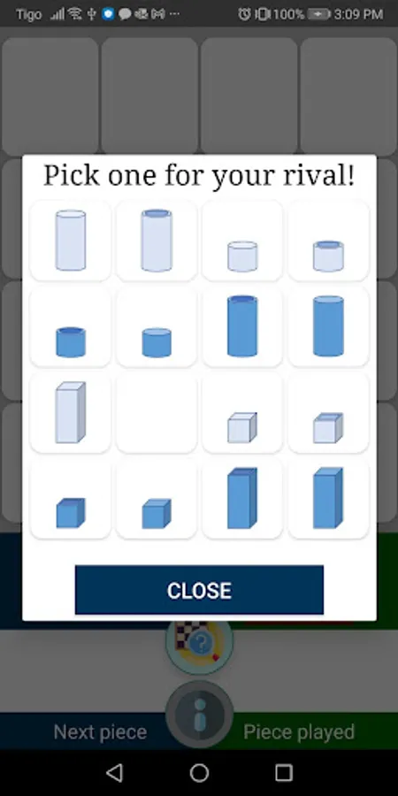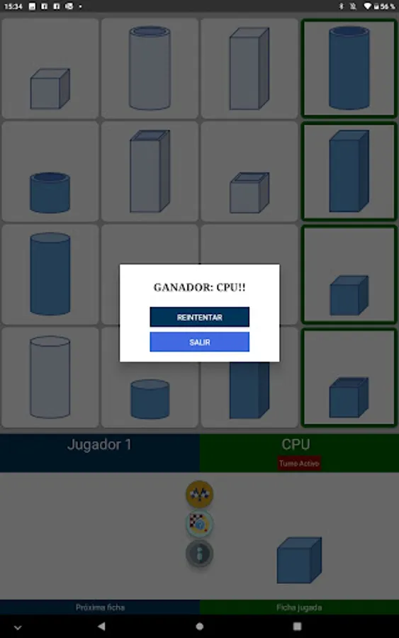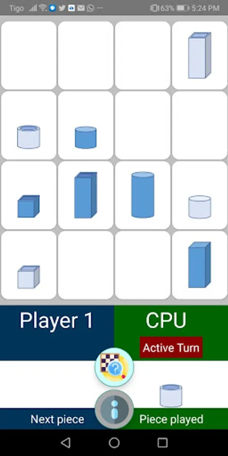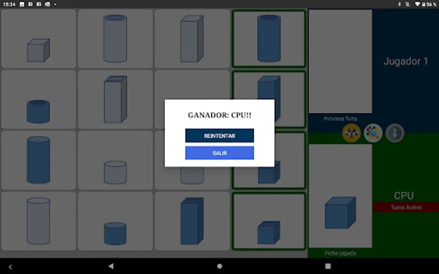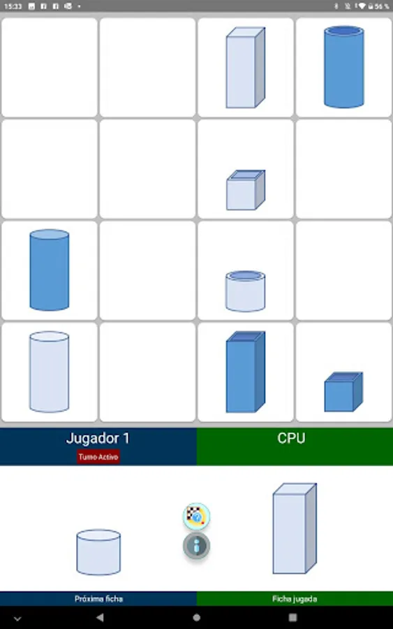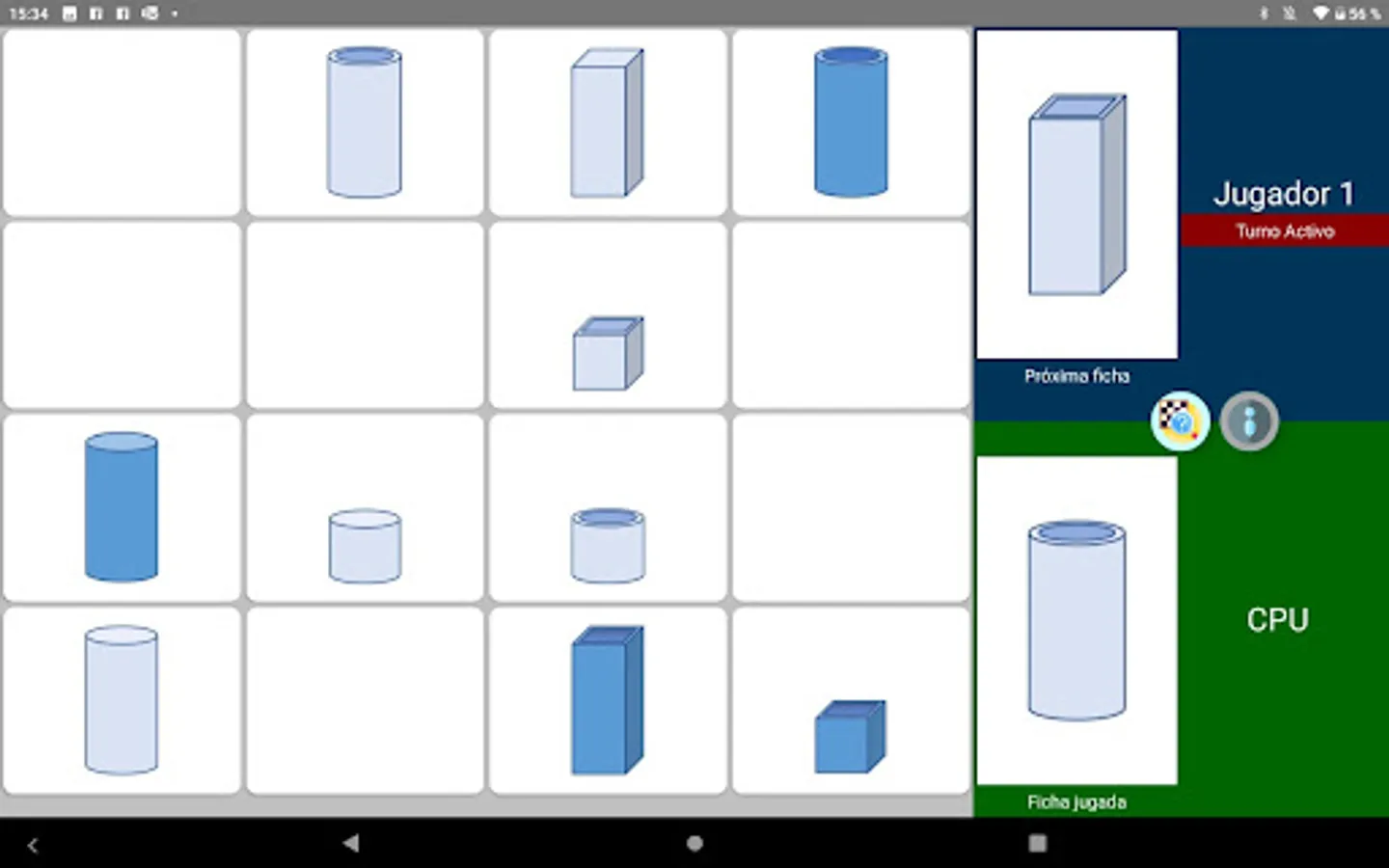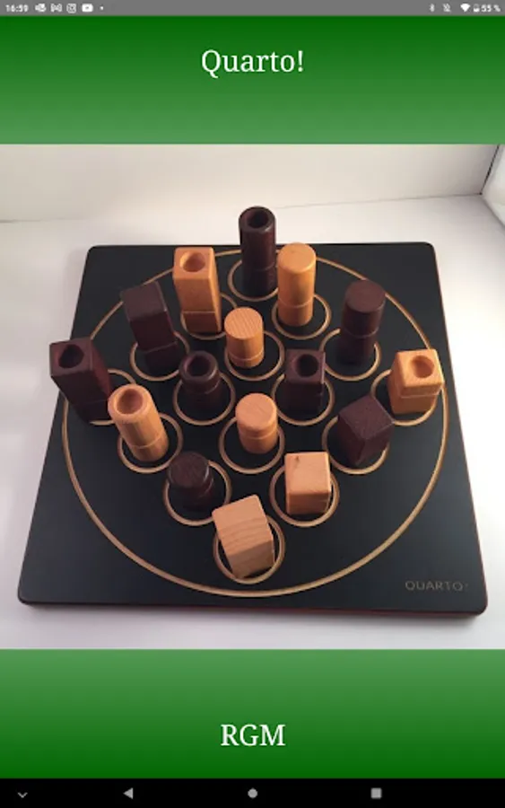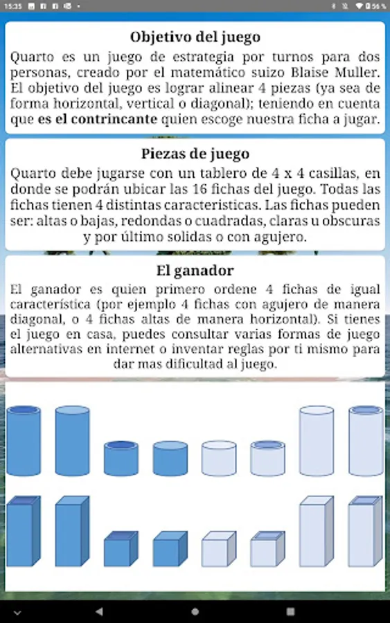 Available in English and Spanish. Quarto is a turn-based strategy game for two, created by the Swiss mathematician Blaise Muller. The objective of the game is to align 4 pieces (either horizontally, vertically or diagonally) on a 4x4 board. Each game piece has 4 different characteristics: height (tall or short), color (dark or light), mass (solid or hollow) and shape (square or circle). Additionally, take into account that our opponent chooses our game piece to play.