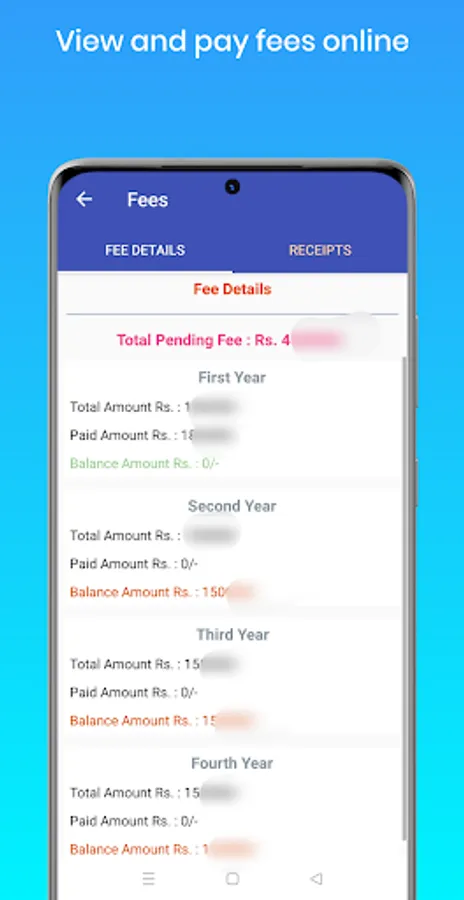 • Fee details – View the complete fee details (paid/balance/receipts)