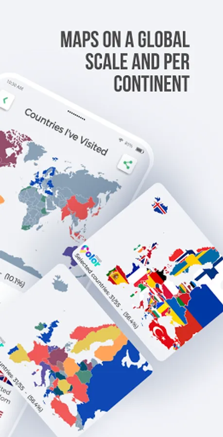 With ColorMap you can create different maps based on your own purpose. In each one of them you can tag different countries with the colours of your choice: either it's your travel map where you keep track on your visited countries, or a map of your bucket-list and next travel destinations, or simply you want to generate a coloured map where you tag different countries based on a specific topic (politics, history, news, religion,...).
