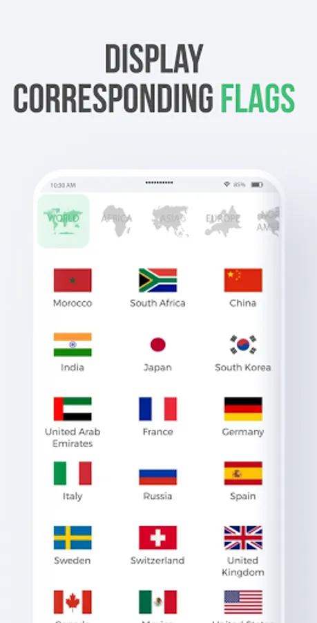 - Countries and flags: The app also displays the list of chosen countries including their flags.