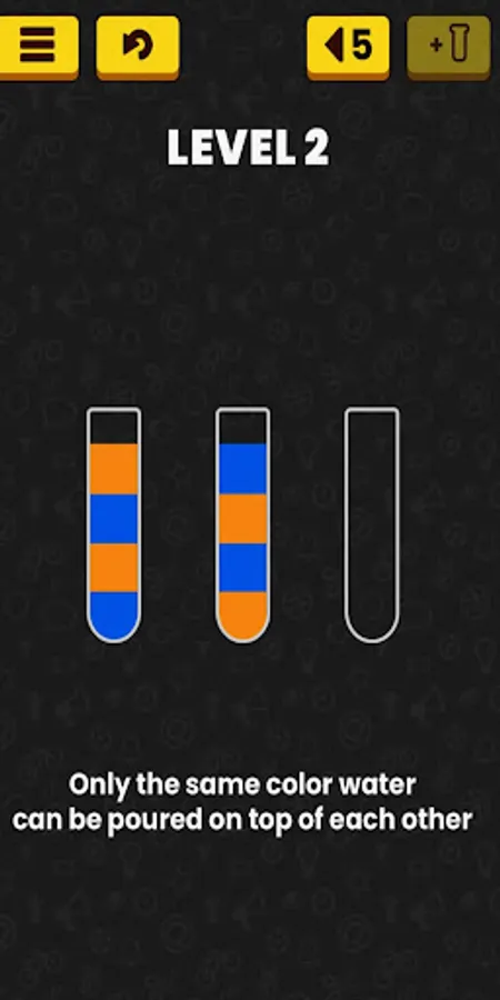 🧪Click on any tube and pour the colored liquid into another tube. The rules is that liquids can only be poured into the tubes with enough space or the same color.