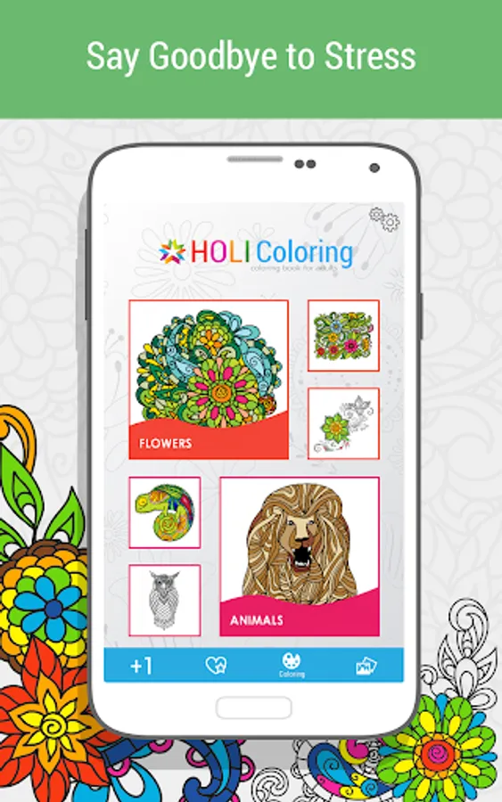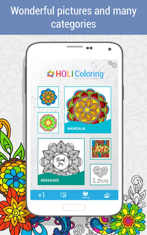 HOLI Coloring Book for adults. Your mandala, pleasantly relaxes after a hard day, soothing images, colors and sounds of nature.