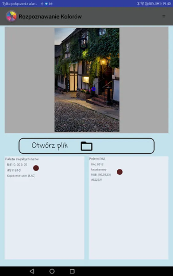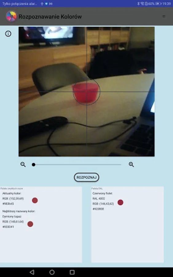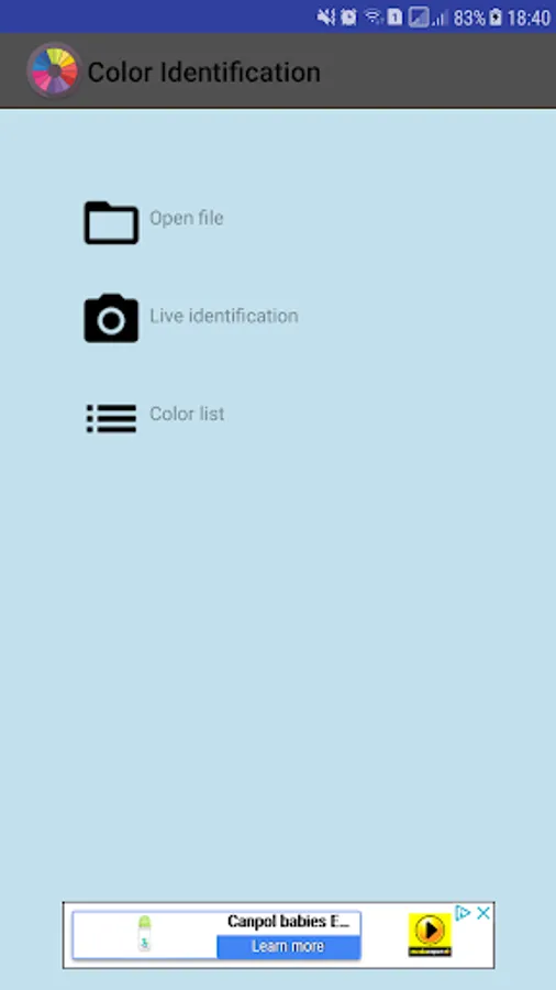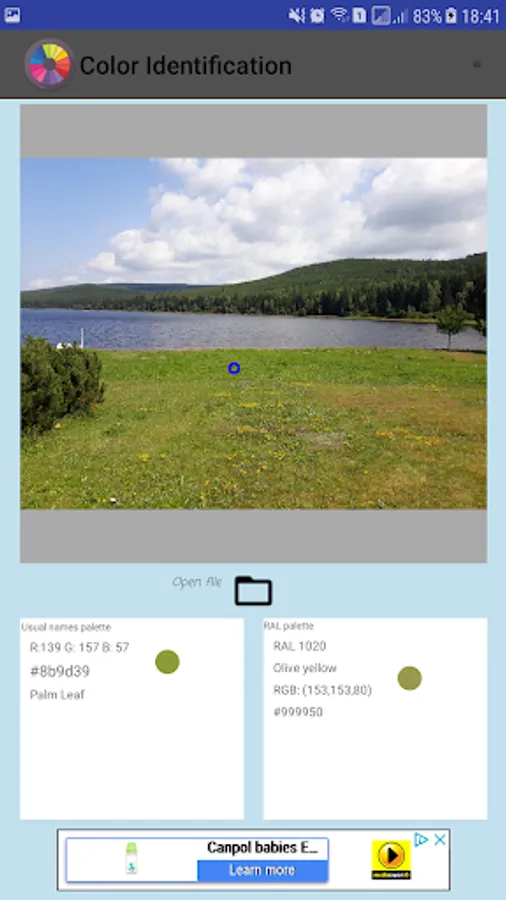 Color Identification is a simple application for recognize color names. The application provides HTML (CSS color), the RGB designation and RAL code of the checked area.