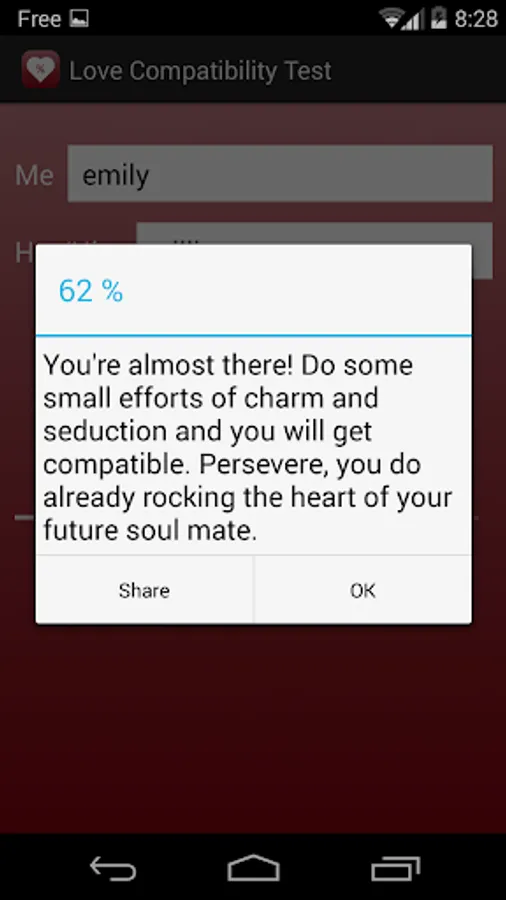 You just have to launch the application, enter your name and the name of your possible soulmate, click on start and the calcul is launched. Few seconds later you obtain your compatibility result.
