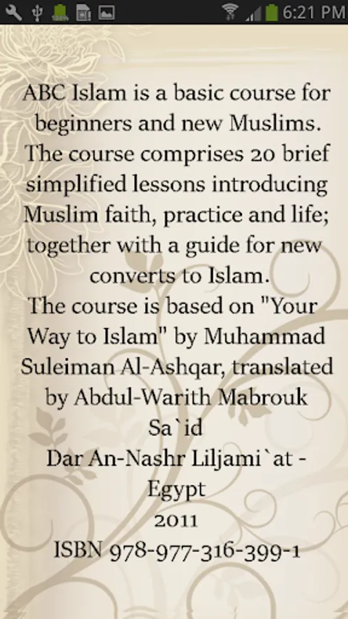 The course comprises 20 brief simplified lessons introducing Muslim faith, practice and life; together with a guide for new converts to Islam.
