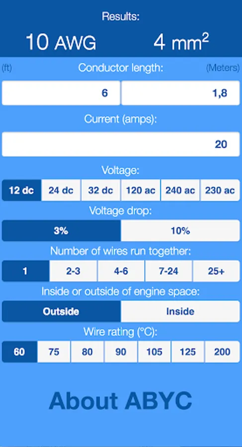 The ABYC Wire Sizer app easily calculates minimum conductor size for boats based on the parameters you enter. American Wire Gauge (AWG) results are based on ABYC requirements and the metric (mm2) results are based on ISO requirements.