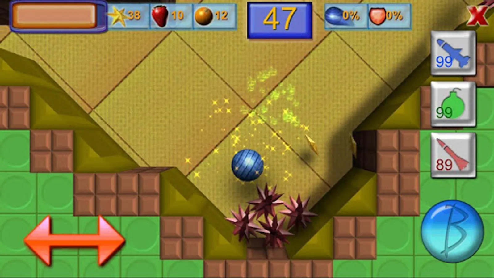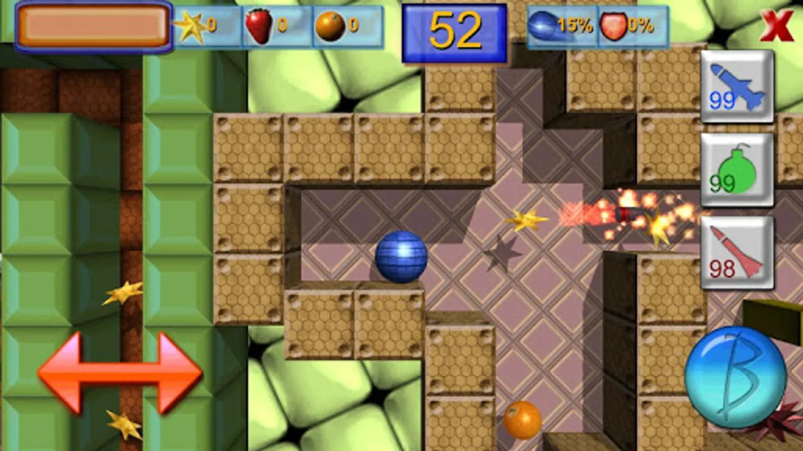 You can improve both the defense and the height of the jump of your red or blue ball, obtaining delicious fruit and crushing it with the ball. You will also collect stars and you can get ammunition, bullets and projectiles, which is available in the store and free of charge for all content, both for upgrades and for missiles. Do not forget to run as much as you can before you run out of time ...