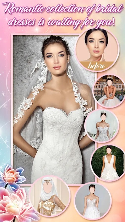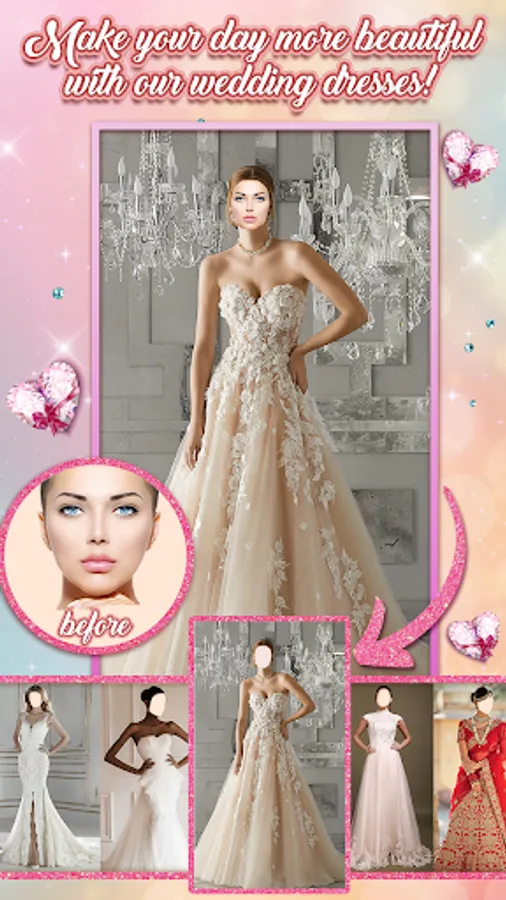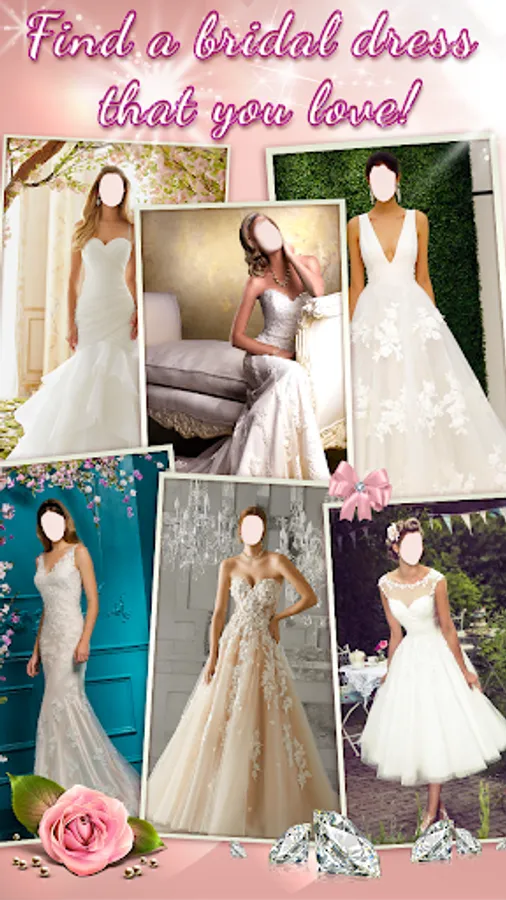 - Romantic photo editor for girls who want to try beautiful "wedding gowns"!