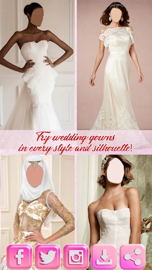 This awesome "fashion app" helps you to try some dresses and choose the best for you! Find your dream wedding dress in this lovely collection of beautiful wedding dresses! "Try on wedding gowns" in every style and silhouette. >>> Upload your photo from your phone's camera roll or simply use one of our many fit models as your stand-in and start selecting the wedding dresses you'd like to try on. As a final step, you can share photos of yourself in your favorite wedding dresses on social networks.