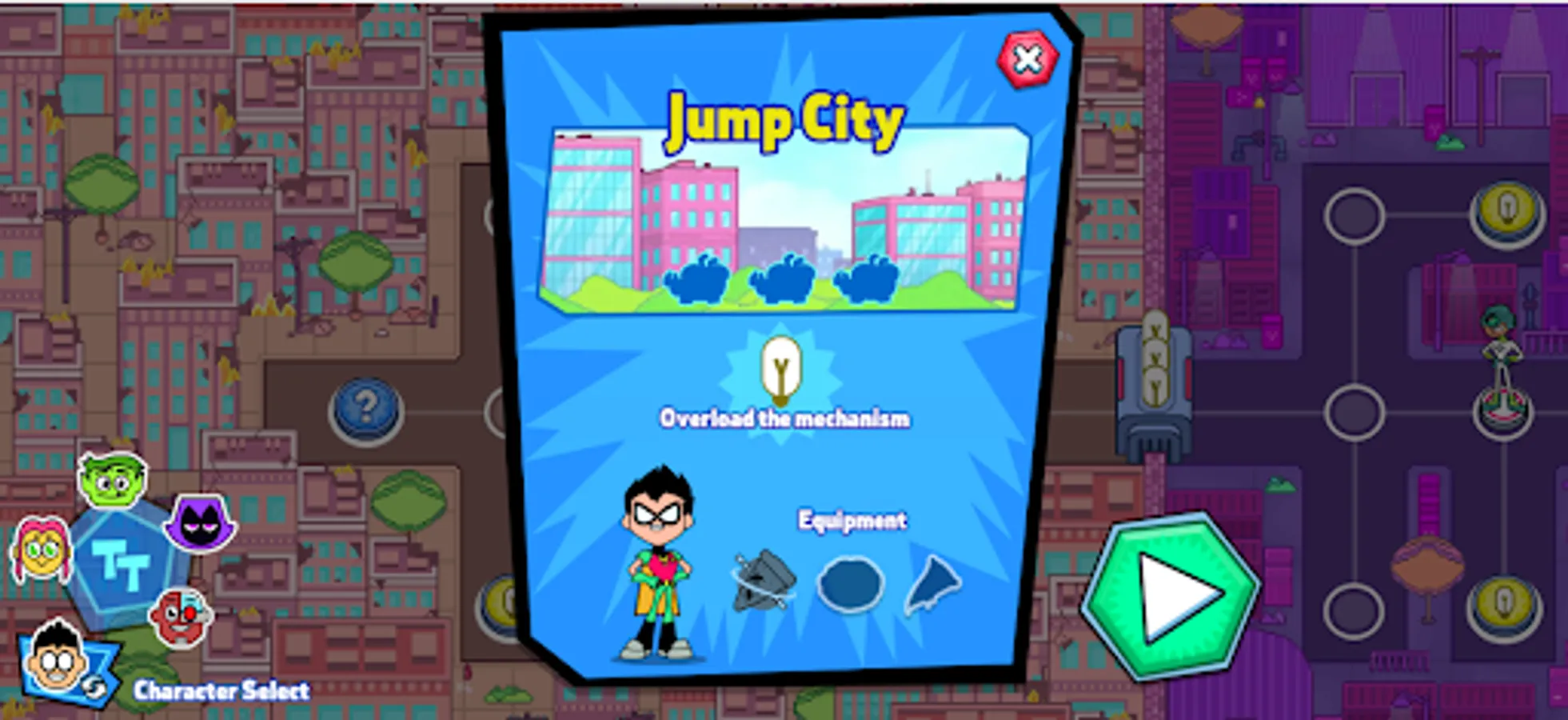 Jump City, where the TenTitans have their base, has now been taken under assault by five enemies, so the team has separated, and each of them is going up to face off with a different villain, with you having to help each team member, starting with Robin!
