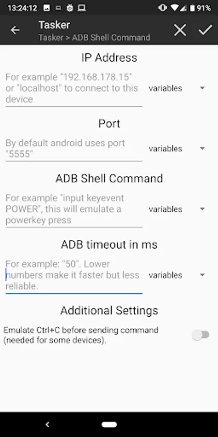 - All commands in a single action are automatically followed with an "exit" command so to close the ADB connection. This means that if you want to send multiple commands that are depending on each other, you will need to put them in a single Tasker action and separate them with ";".