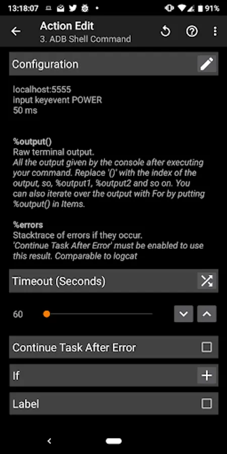- If you want multiple actions of my plugin to run after each other in a Tasker task, please keep the timeout set as is. Tasker will continue when the command is sent.