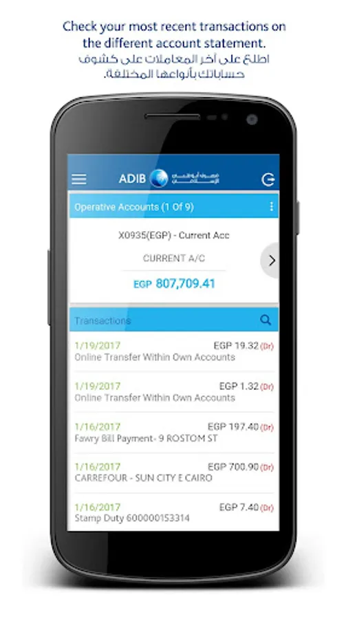 By simply logging in with your same ADIB Egypt Internet Banking Username and Password, you can now enjoy a variety of banking services - from the palm of your hand - on the different types of accounts in addition to conducting financial transactions within and outside your own accounts.