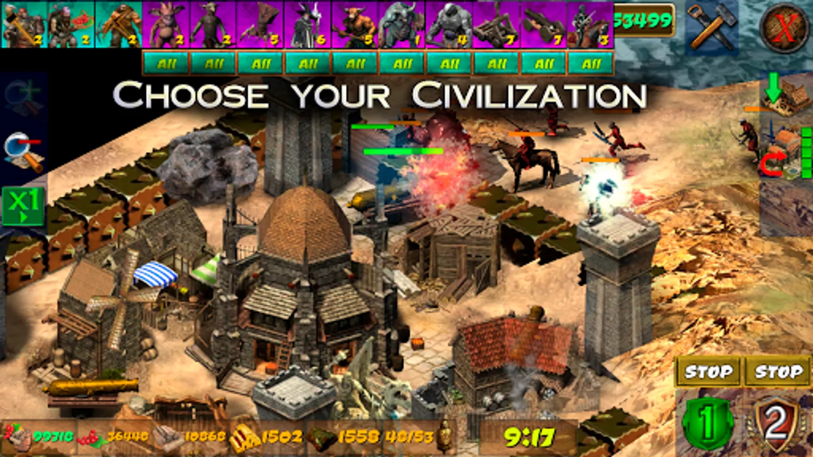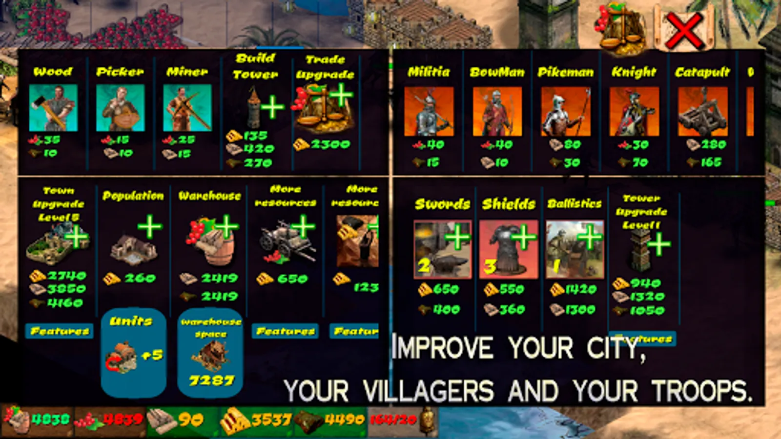 You have a wide range of units starting from simple warriors or archers to wizards and mobile cannons. (each one has a price in gold, food or iron)