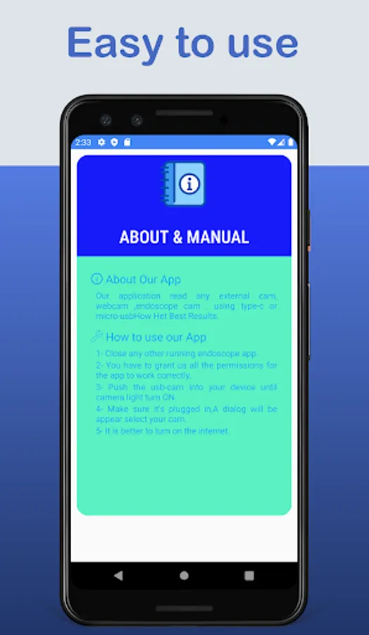 Endoscope app for android open the app and enter the USB of his endoscope camera in your phone click on the camera icon click on ok now you can see the endoscope camera is working.