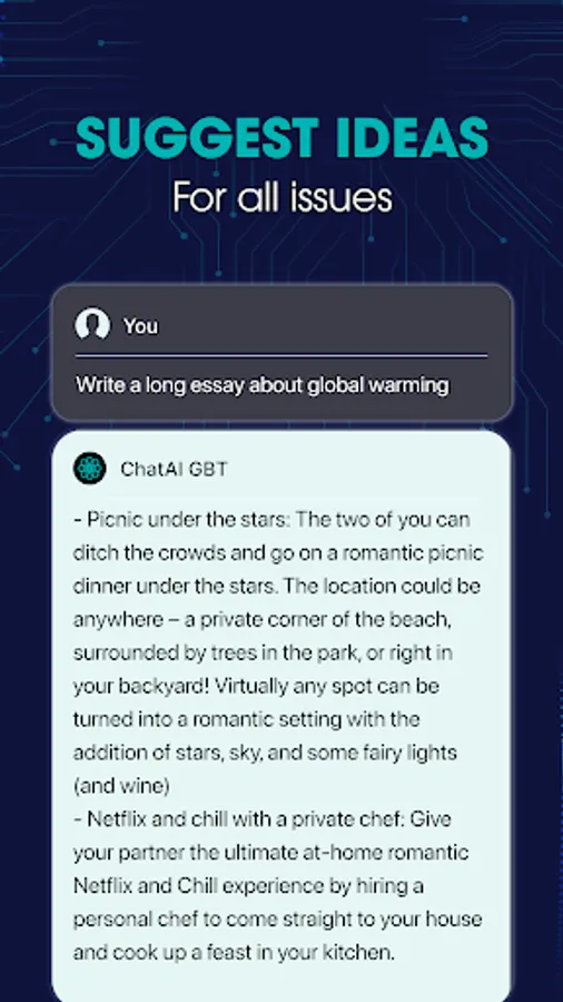 Expert of exciting ideas: If you need any crazy or funny ideas for parties or simply ideas for a presentation about a new project at the company, this ChatGBT tech for android is for you because the AI system is a great creator