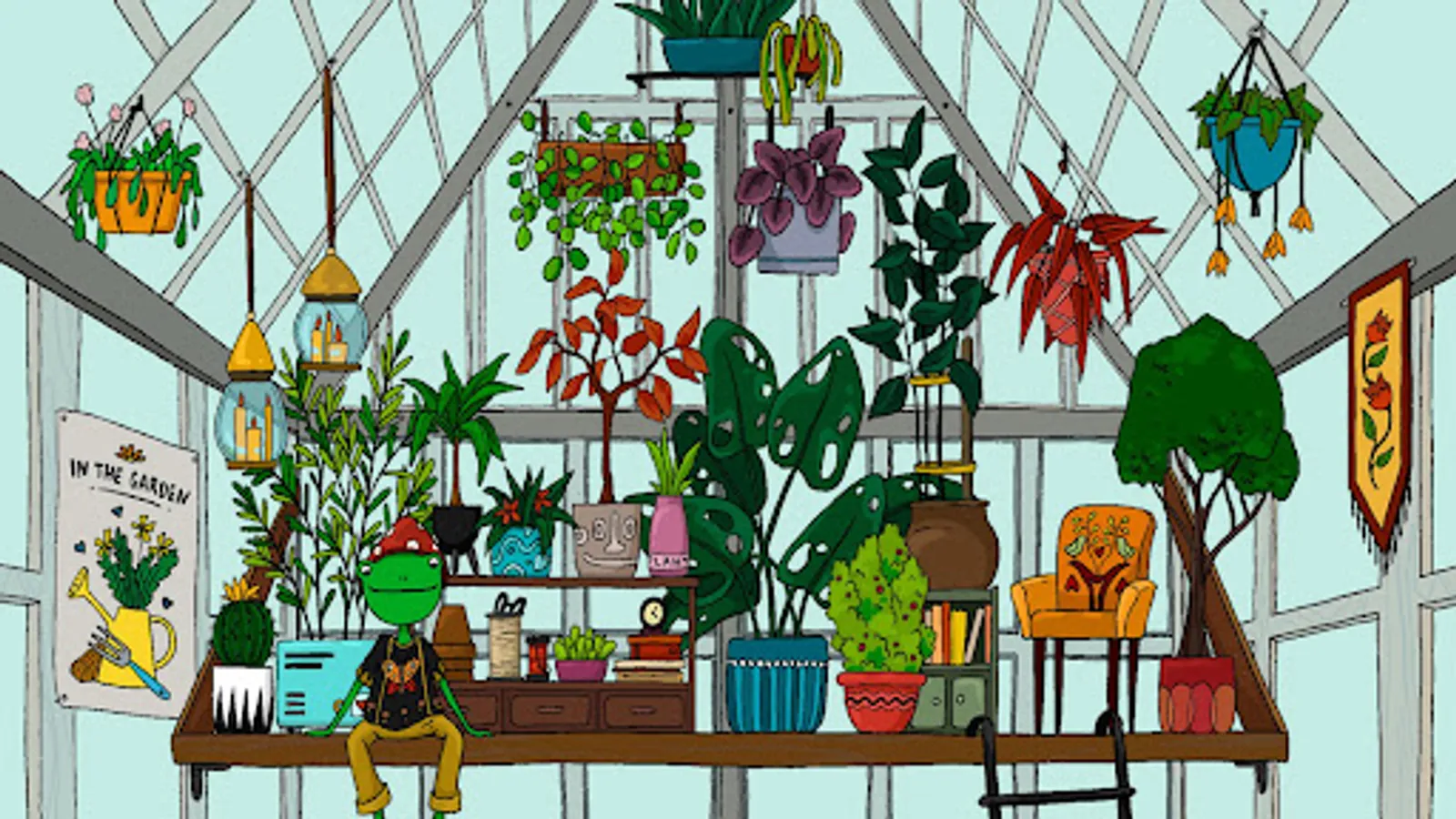 In the greenhouse you can grow a lot of rare plants🍃 The more flowers in your greenhouse, the bigger your herbarium book becomes, where you can learn tips on caring for plants 🌾 Each flower gives 15 coins every 12 hours. You can discover more than 100 unique plants in the game. Frog Bart likes to relax in the greenhouse🐸