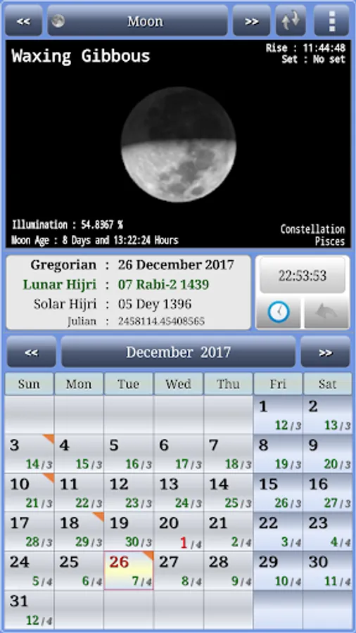 Lunar Hijri Dates can be adjusted in the Calendar Settings or from Calendar Menu but only when you select "Lunar Hijri (Civil Epoch)".
