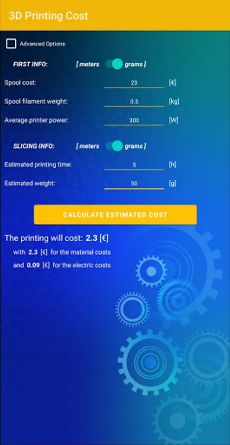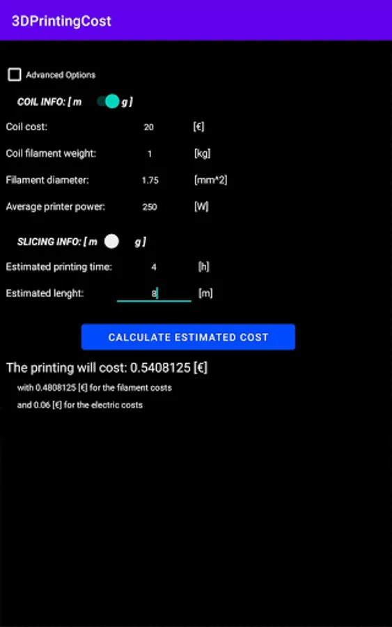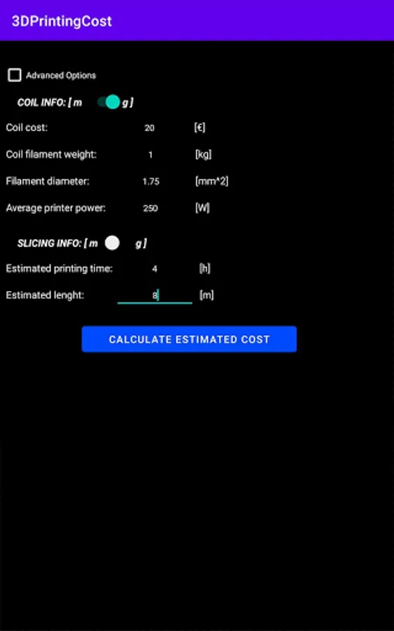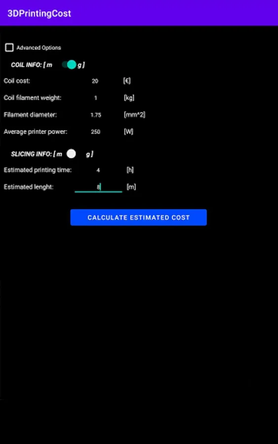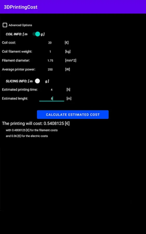 This APP allow you to calculate the 3D printing costs by adding the slicing info and the filament info!