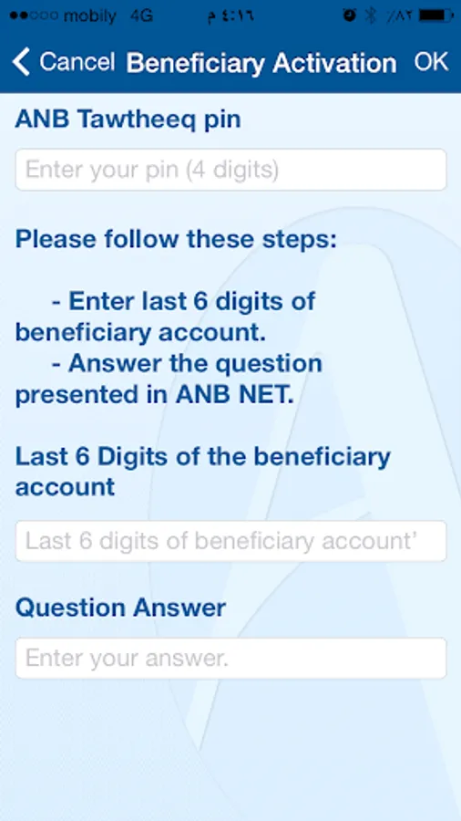 ANB Tawtheeq enables the customer to get Login, Transaction and Beneficiary Activation codes directly through an application installed on his/her mobile without the need to wait to receive a SMS on the mobile.