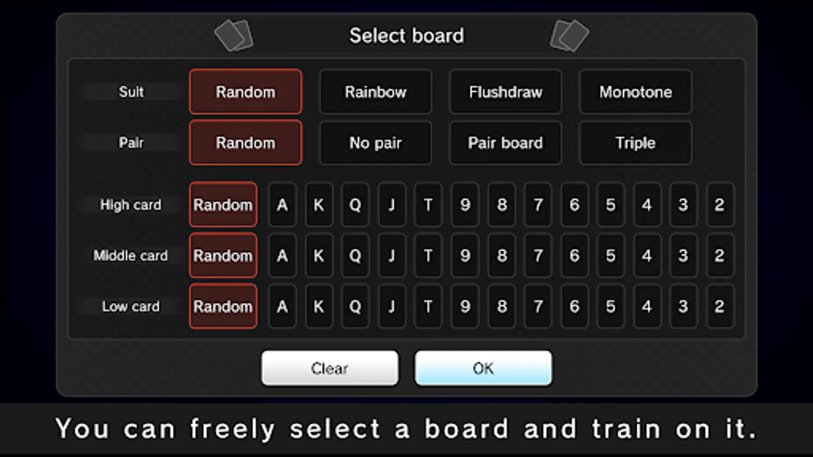 ・Play with your favorite board textures "Monotone Board", "A High Board, etc.", "Pair Board", "Specify all 3 cards"