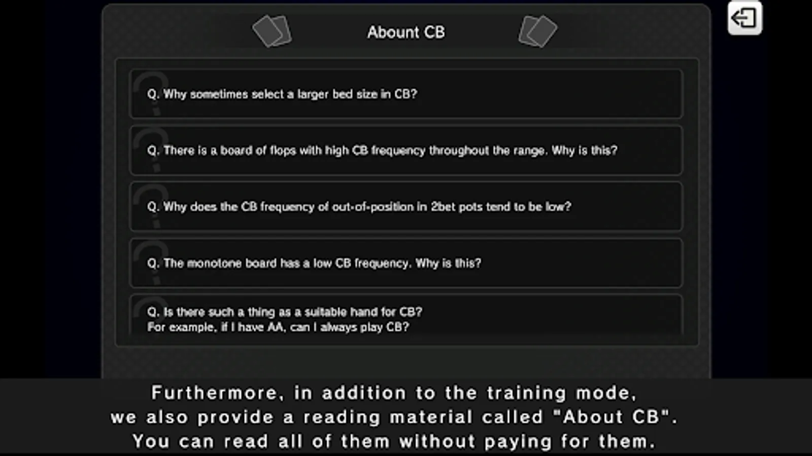 In addition to the training mode, there is also a reading material called "Explanation about CB",